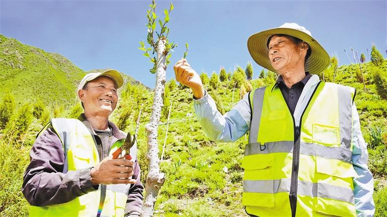 在2號片區(qū),一支特殊養(yǎng)護(hù)隊伍映入眼簾。十幾位藏族村民在技術(shù)員的指導(dǎo)下修剪枝條,掌握技術(shù)后將成為專業(yè)管護(hù)人員。村民的動作略顯生疏,但專注的神情流露出對樹苗的珍視。