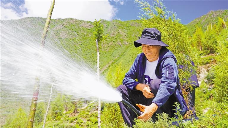 南北山綠化工程墨竹工卡縣段1號片區(qū)養(yǎng)護(hù)員給苗木澆水。