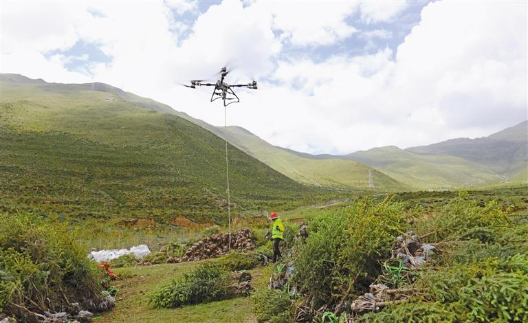南北山綠化工程墨竹工卡縣段11號片區(qū)無人機(jī)在運(yùn)送苗木。