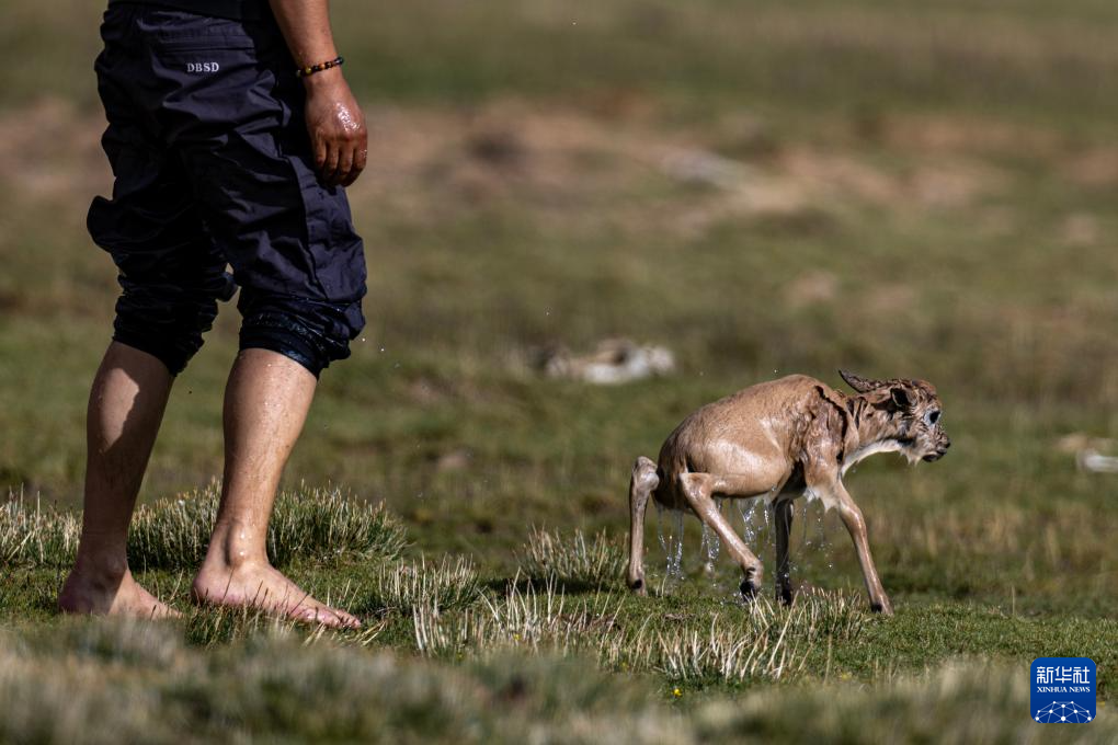 這是一只剛被管護(hù)隊(duì)員救上岸的藏羚羊幼崽(7月14日攝)。新華社記者 姜帆 攝