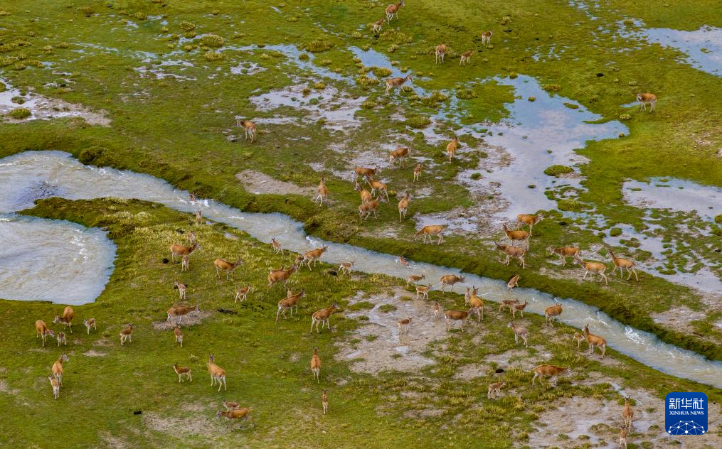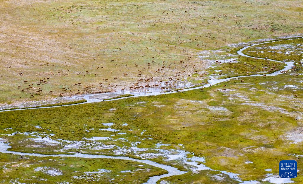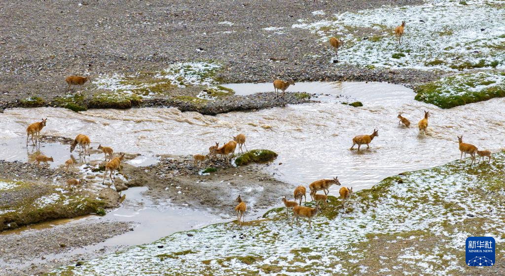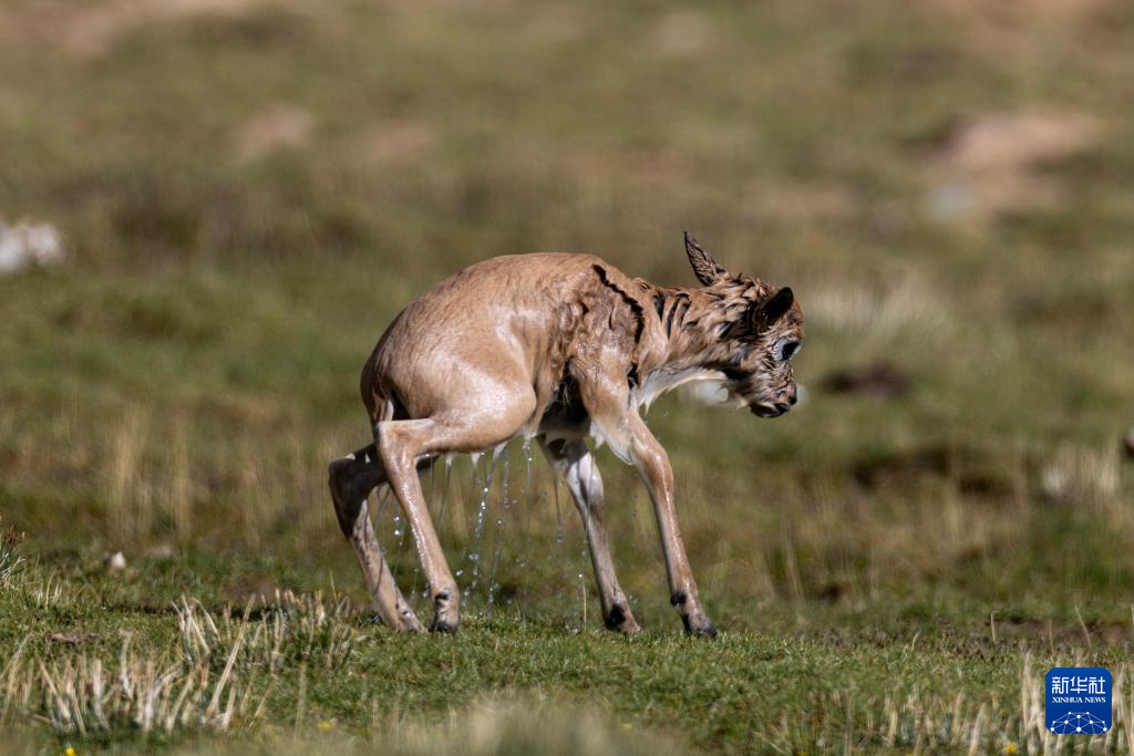 一群帶著幼崽的藏羚羊成功渡過(guò)森隆藏布河,幼崽身上水跡未干(7月15日攝)。新華社記者 姜帆 攝