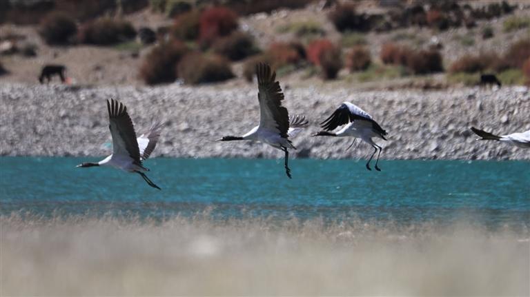 據(jù)了解,每年10月中下旬,前往墨竹工卡縣越冬的黑頸鶴會陸續(xù)抵達,它們的活動范圍主要集中在唐加鄉(xiāng)、扎西崗鄉(xiāng)、工卡鎮(zhèn)、甲瑪鄉(xiāng)及扎雪鄉(xiāng)一帶,成為當(dāng)?shù)厍锒竟?jié)一道獨特的生態(tài)風(fēng)景線。在西藏,黑頸鶴的身影遍布55個縣域,它們主要選擇高原河流、湖泊、沼澤和草甸等濕地作為棲息地。隨著西藏生態(tài)環(huán)境的改善以及人們對野生動物保護意識的增強,黑頸鶴的種群數(shù)量也在逐漸增多。2000年,黑頸鶴的數(shù)量大概是4000只,到現(xiàn)在整個西藏越冬區(qū)記錄到黑頸鶴的數(shù)量超過1萬只。