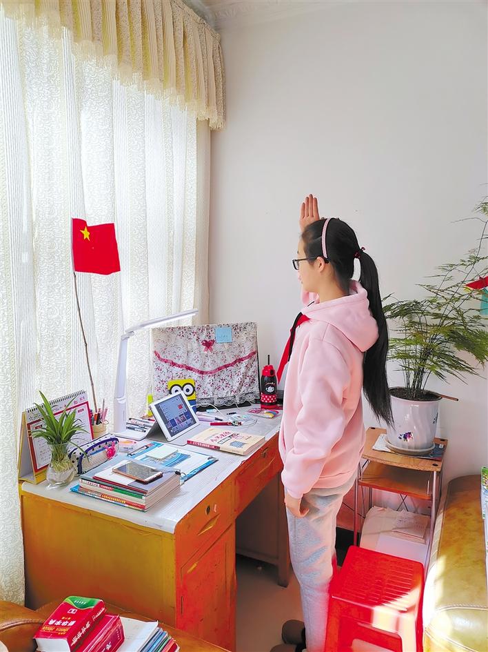 圖為3月3日,拉薩一小的學(xué)生在家參加線上升國(guó)旗儀式。 記者 周科 通訊員 侯俊 攝