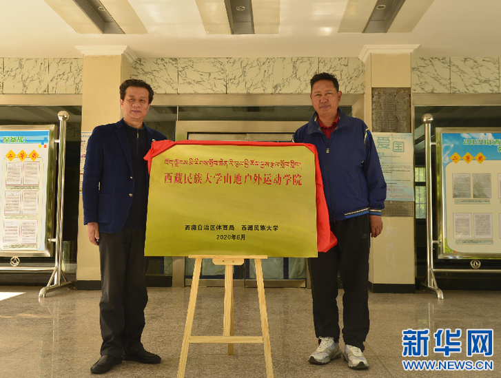 1日,西藏民族大學(xué)校長劉凱(左)和西藏自治區(qū)體育局局長尼瑪次仁(右)為西藏民族大學(xué)山地戶外運(yùn)動學(xué)院揭牌。新華社記者 格桑邊覺攝