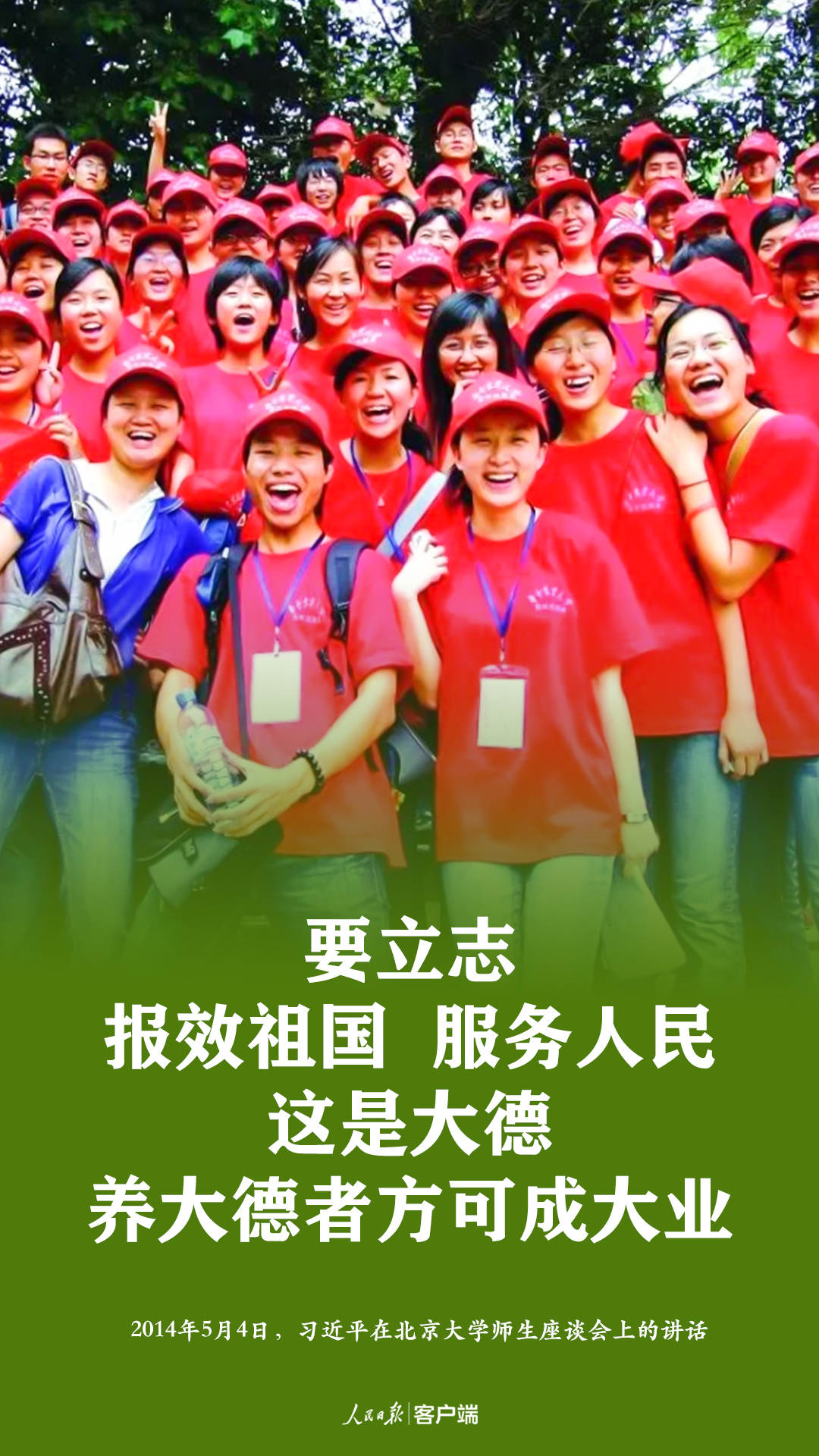 他還囑咐同學(xué)們,“要把自己的理想同祖國的前途、把自己的人生同民族的命運(yùn)緊密聯(lián)系在一起,扎根人民,奉獻(xiàn)國家”,“時(shí)時(shí)想到國家,處處想到人民,做到‘利于國者愛之,害于國者惡之’”。