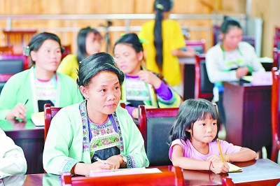 9月12日,在桂黔交界的大苗山深處,代時(shí)英和女兒在烏英苗寨“雙語(yǔ)雙向”培訓(xùn)班聽(tīng)課。新華社發(fā)