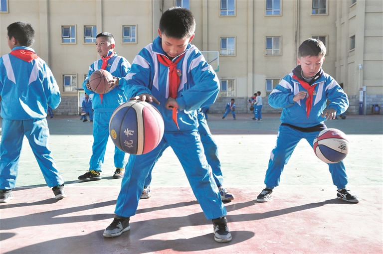 圖為拉薩市實驗小學學生在教練員帶領下進行籃球訓練。趙耀鐵攝