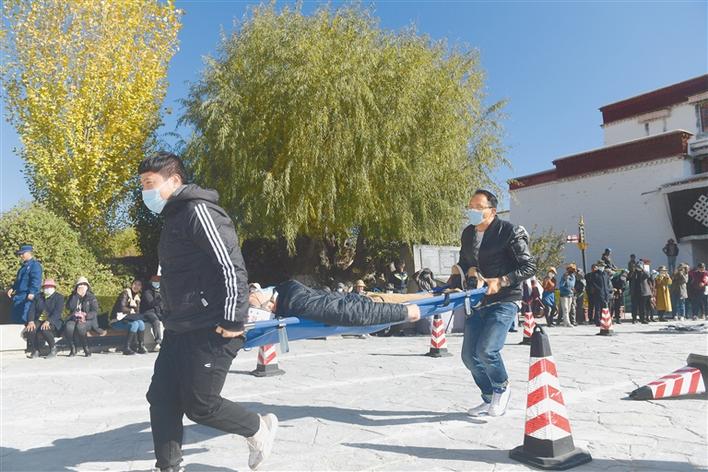 圖為11月9日,布達拉宮管理處工作人員正在進行火場救援比賽。