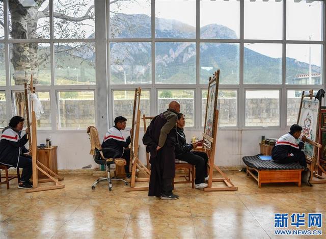 嘎瑪?shù)吕绽先嗽谖鞑夭际锌ㄈ魠^(qū)嘎瑪鄉(xiāng)的民族手工藝培訓基地里教學員們畫唐卡(10月3日攝)。新華社記者 普布扎西 攝