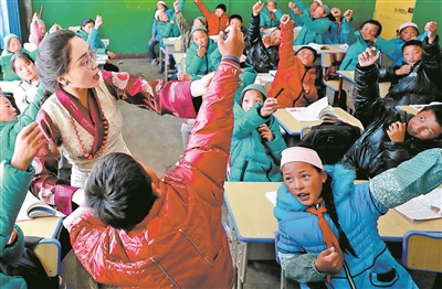 教學中,桑丁卓瑪注意活躍課堂氣氛,調動學生的學習積極性。一堂漢語文課上,她引導學生根據課文描述,模仿主人公拉弓射箭的動作。