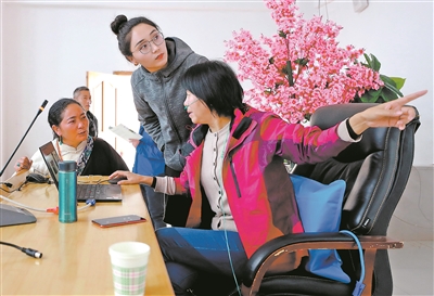 培訓過程中,授課專家、中國教育科學研究院教師發(fā)展研究所副所長卿素蘭博士(右一)由于高原反應,身體出現不適,桑丁卓瑪臨時客串起“助教”,幫助調試教學設備、進行范文朗讀等。