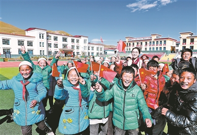 和學生們在一起,是桑丁卓瑪最開心的時刻。她專門給學生帶來國旗、國旗貼,為他們講述國旗下民族團結好故事。