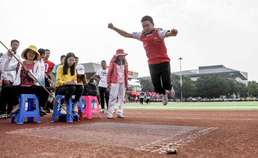 11月26日, 廣西大學(xué)附屬中學(xué)初中年級(jí)學(xué)生在立定跳遠(yuǎn)比賽中。新華社記者張愛林?jǐn)z