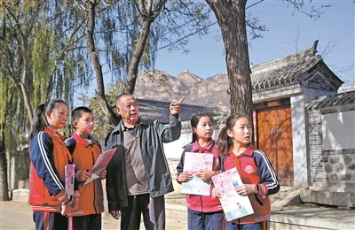 長(zhǎng)城腳下美麗的河西村為什么會(huì)有137個(gè)姓氏?走在村中古樸的小路上,聆聽(tīng)老支書張玉山的講述,古北口鎮(zhèn)中心小學(xué)學(xué)生探尋河西村多民族、多姓氏融合的“百姓村”成因。樊世剛 攝