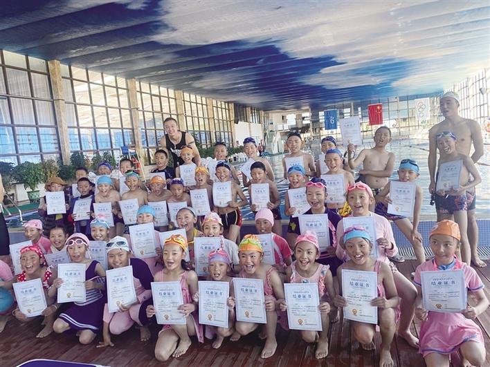 一批小學(xué)生完成游泳培訓(xùn)拿到證書(shū)。