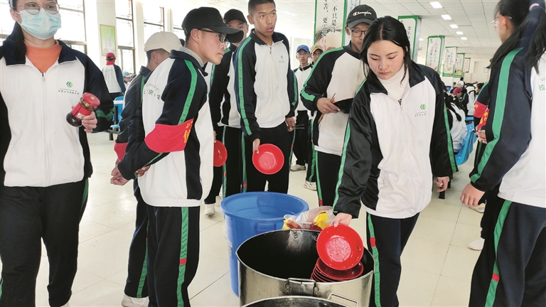 中午13時,在拉薩北京實驗中學食堂里,學生有序排隊取餐,根據(jù)“吃多少拿多少”的原則進行點餐。用餐結(jié)束后,學生排隊放置碗筷,記者注意到,大多數(shù)學生用過的餐碗非常干凈,沒有浪費主食的情況,用來裝食物殘渣的泔水桶里并沒有多少被倒掉的殘羹剩飯。
