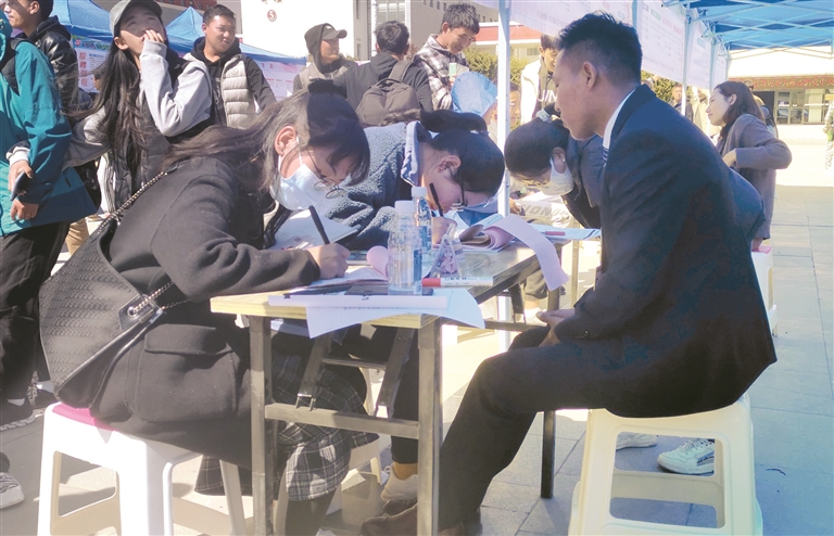 拉巴占堆是西藏大學藏語言文學師范專業(yè)的一名大四畢業(yè)生,他曾在拉薩北京實驗中學實習過,對教育工作充滿熱情。招聘會現(xiàn)場,他向卓夢培訓等教育相關企業(yè)都投遞了簡歷。“我投了幾份簡歷了,希望能夠找到和自己專業(yè)相關的工作,實現(xiàn)自己的價值?!崩驼级颜f。