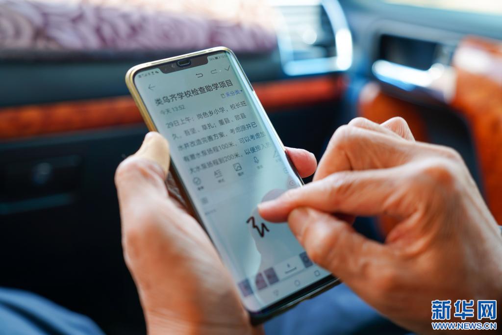 5月1日,李純民在前往西藏昌都市類烏齊縣伊日鄉(xiāng)小學(xué)途中,整理記錄此次進(jìn)藏助學(xué)事宜。新華社記者 黃臻 攝