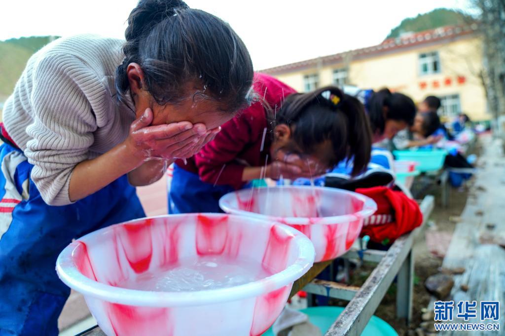 4月30日,在西藏昌都市類烏齊縣桑多鎮(zhèn)第二小學(xué),學(xué)生們用熱水洗漱。這套熱水設(shè)施由李純民發(fā)起的“齊興”助學(xué)獎勵基金捐助。新華社記者 黃臻 攝