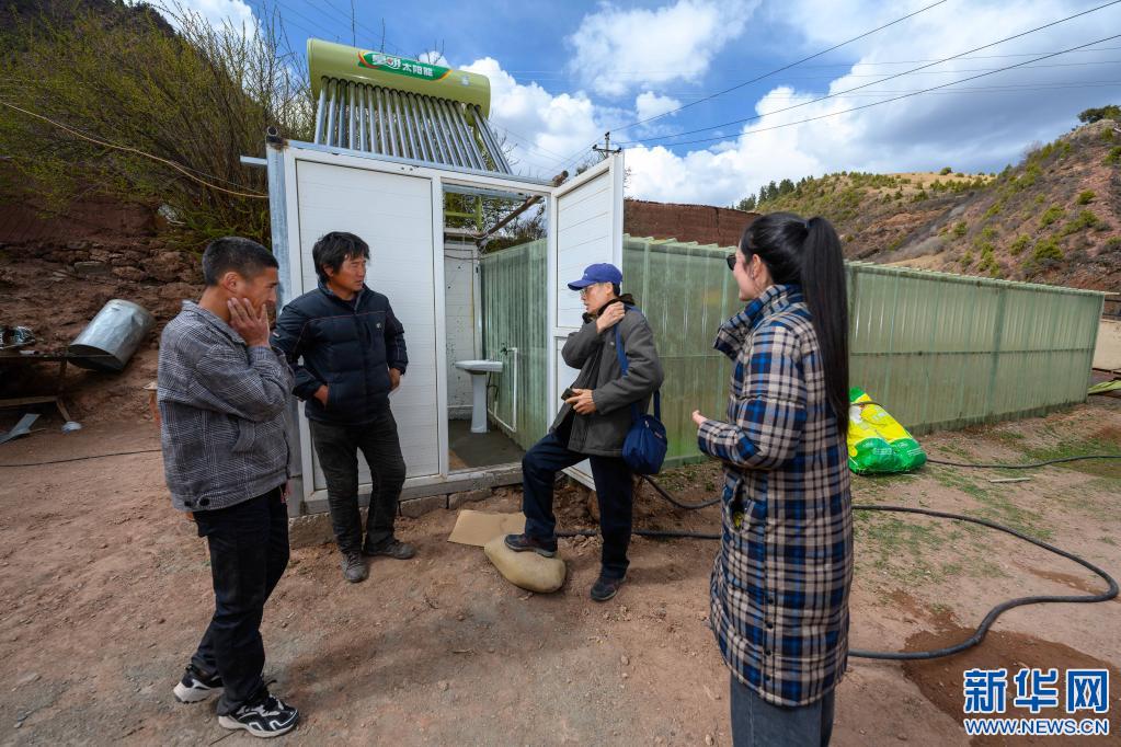 5月2日,李純民趕到西藏昌都市類烏齊縣濱達(dá)鄉(xiāng)濱達(dá)村,為當(dāng)?shù)卮迕裣虬桶偷菂f(xié)調(diào)太陽能熱水器的安裝調(diào)試工作。這是李純民(右二)通過濱達(dá)鄉(xiāng)小學(xué)老師索朗卓瑪(右一)作藏語翻譯,就熱水淋浴室與水沖廁整體改造計劃給向巴巴登(左二)提出建議。新華社記者 劉金海 攝
