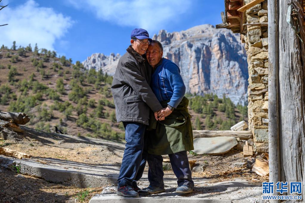 5月3日,李純民前往西藏昌都市類烏齊縣伊日鄉(xiāng)崩日村看望1979年下鄉(xiāng)工作時結(jié)識的房東一家。這是房東的大兒子澤仁多加(右)在家門口熱情歡迎他。新華社記者 劉金海 攝