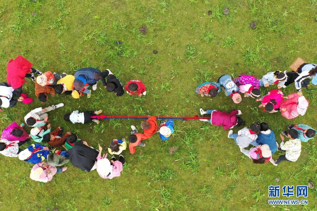 7月14日,河曲馬場小學(xué)的孩子們?cè)诓菰线M(jìn)行拔河比賽(無人機(jī)照片)。新華社記者 杜哲宇 攝