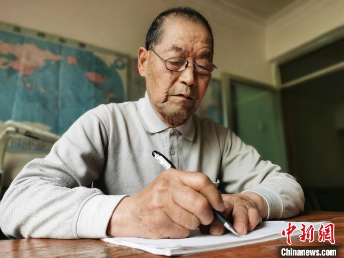 圖為在青海西寧頤養(yǎng)天年的朱汝完向記者展示氣象發(fā)報基本功。 張?zhí)砀?攝
