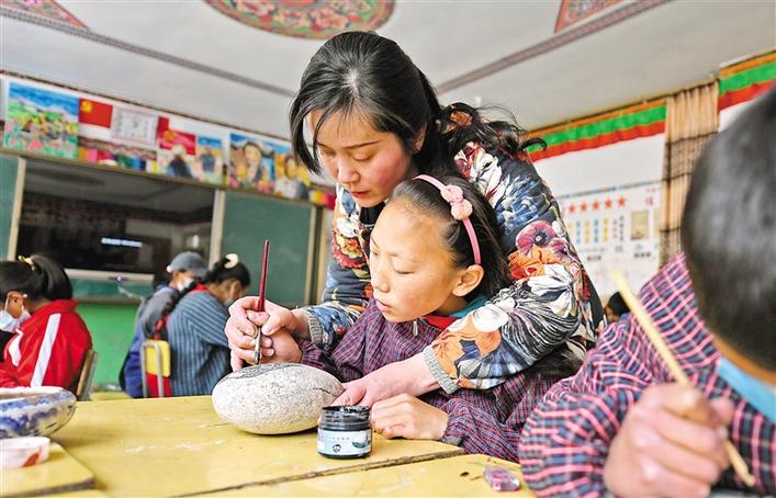 圖為山南市洛扎縣中學的學生正在學習石頭畫。記者 唐斌 次旺 攝