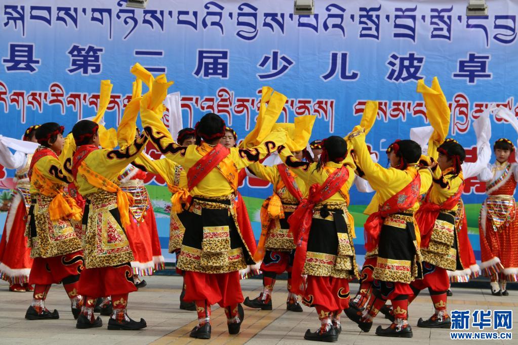 參加西藏波密縣第二屆“少兒波卓波央比賽”的孩子們?cè)诒硌荩?016年10月25日攝)。新華社發(fā) 普文平 攝