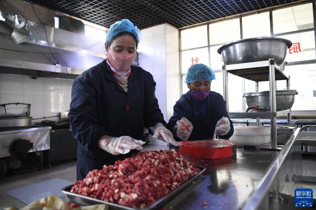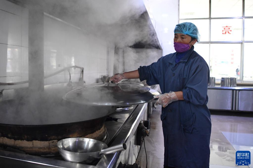 碌曲縣藏族中學(xué)學(xué)生食堂的工作人員在給學(xué)生準備晚飯(8月30日攝)。新華社記者 杜哲宇 攝