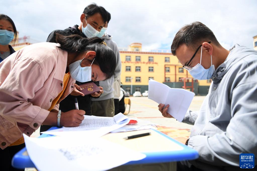 碌曲縣藏族中學(xué)高一新生填寫報到信息(8月30日攝)。新華社記者 杜哲宇 攝