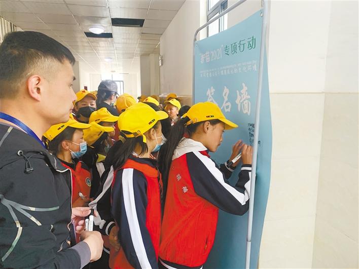 學生在“護苗2021”專項行動簽名墻上簽名。記者 張宇 攝