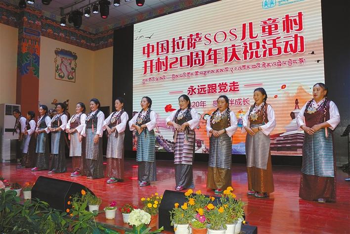 在中國拉薩SOS兒童村開村20周年慶祝活動(dòng)上,SOS村全體干部職工和孩子們共唱國歌。