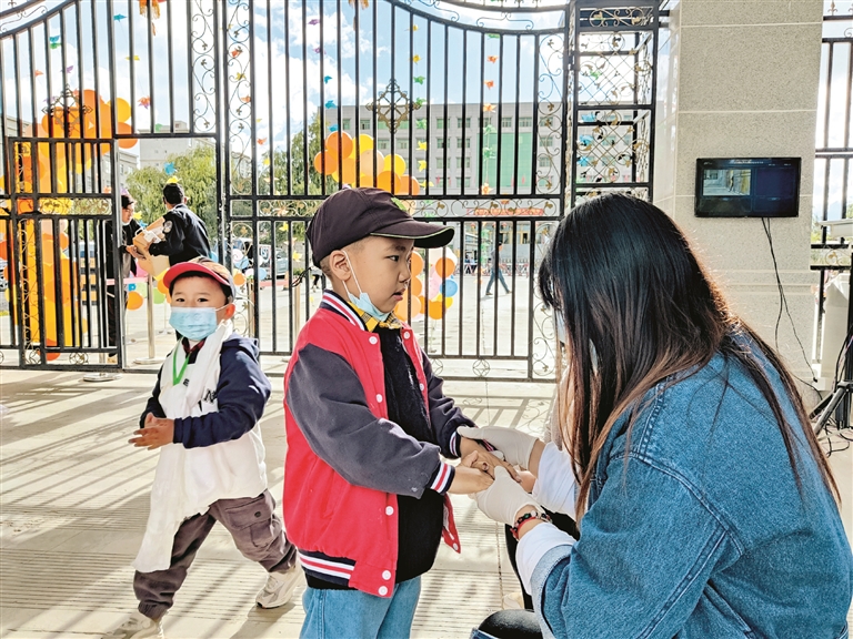 圖為在拉薩江蘇實(shí)驗(yàn)幼兒園門(mén)口,老師對(duì)入園幼兒進(jìn)行手部檢查。拉薩融媒記者 余洋洋攝