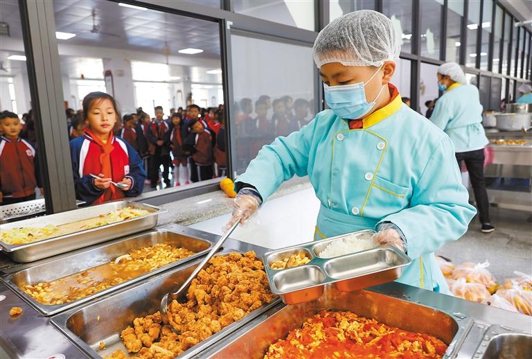 圖為11月10日,紅星小學(xué)學(xué)生在食堂窗口為同學(xué)分餐。新華社發(fā)(李肅人 攝)