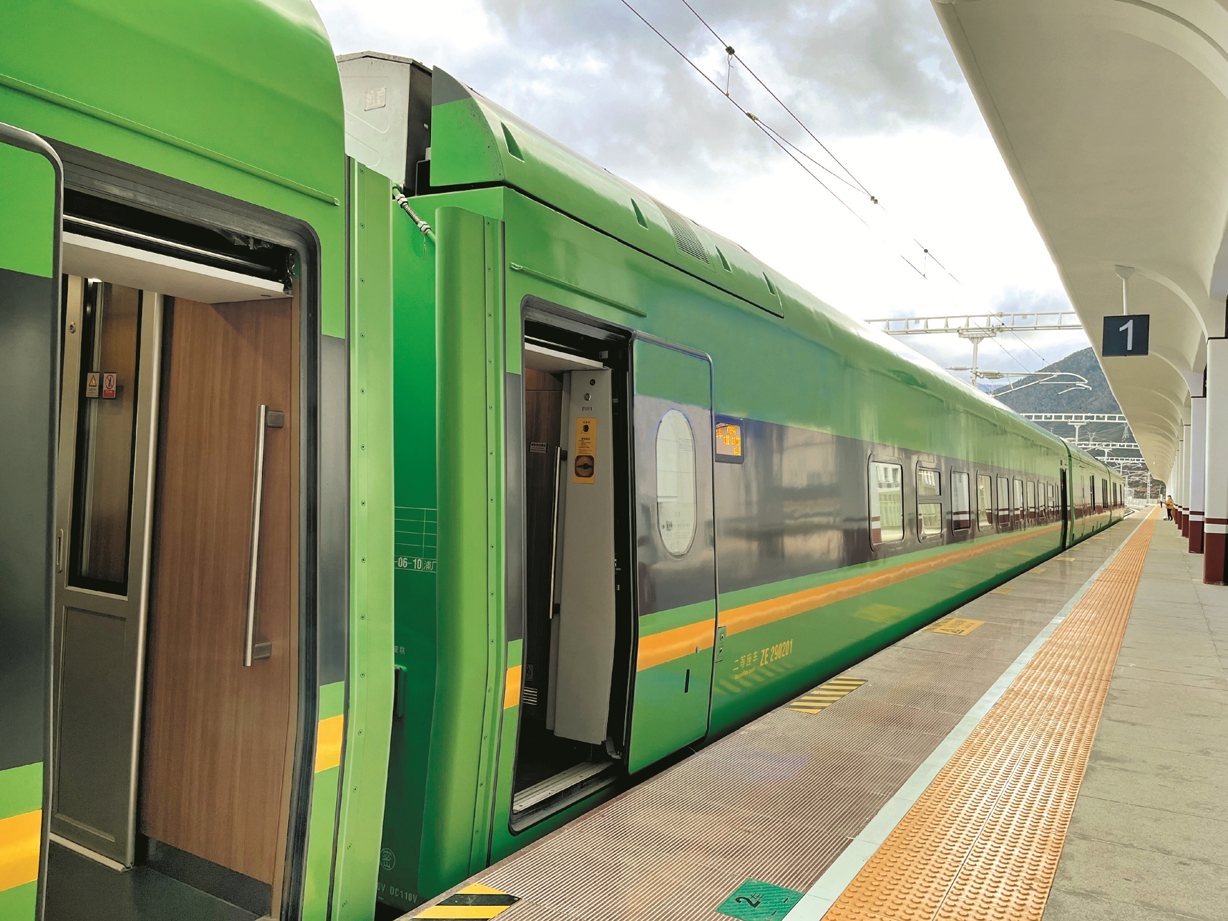 拉林鐵路是我國首列雪域高原電氣化鐵路,開通了拉薩至林芝九個中間客貨辦理站點,包括拉薩、貢嘎、山南(桑日)、加查、朗縣、米林、林芝等。列車穿行在岡底斯山和喜馬拉雅山中的藏南谷地,途經三個市七個縣(區(qū)),全長435.48公里,設計時速160公里,設定商務座、一等座、二等座三個等次,中間編掛拖車,編組為12輛,定員755人。
