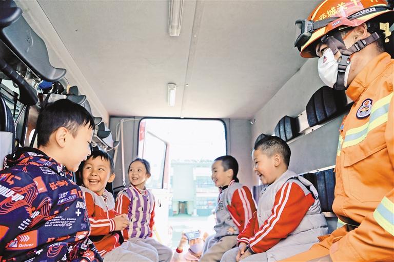 圖為萌娃參觀乘坐消防車。