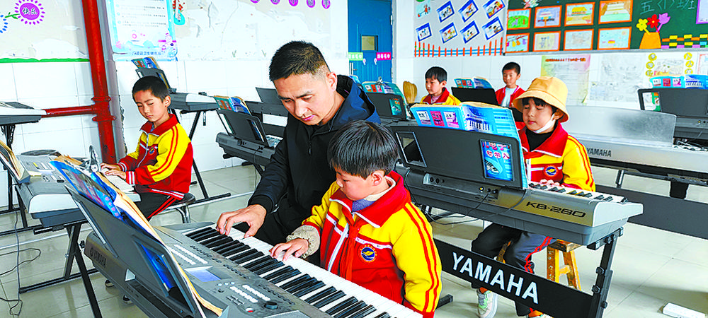 “我會教他們認樂譜、怎么卡節(jié)奏、唱什么聲部,經(jīng)過長期堅持學習,孩子們進步很快?!敝艿猛呏笇W生彈奏電子琴的指法,邊笑著和我們聊到,自從2017年,學校配備了專門的音樂教室,每堂課他都會堅持使用樂器,以此來培養(yǎng)孩子們的音樂素養(yǎng),效果非常不錯。