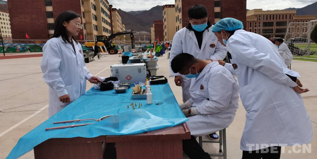 藏醫(yī)藏藥專業(yè)的同學(xué)們?cè)诶蠋煹闹笇?dǎo)下,有條不紊地進(jìn)行著火灸,三兩個(gè)同學(xué)一起配合,在“患者”頸部選定穴位,點(diǎn)火,看火,直至火焰熄滅,一次火灸時(shí)間為10至15分鐘。在火灸演示后方,同學(xué)們正展示著藏藥足療,濃郁的藥草味、熟練的手法盡顯藏醫(yī)養(yǎng)生療法特色。
