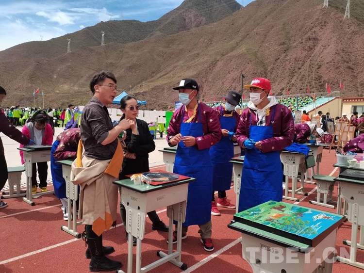 圖為扎西格勒老師教授唐卡漆畫專業(yè)同學(xué)作畫