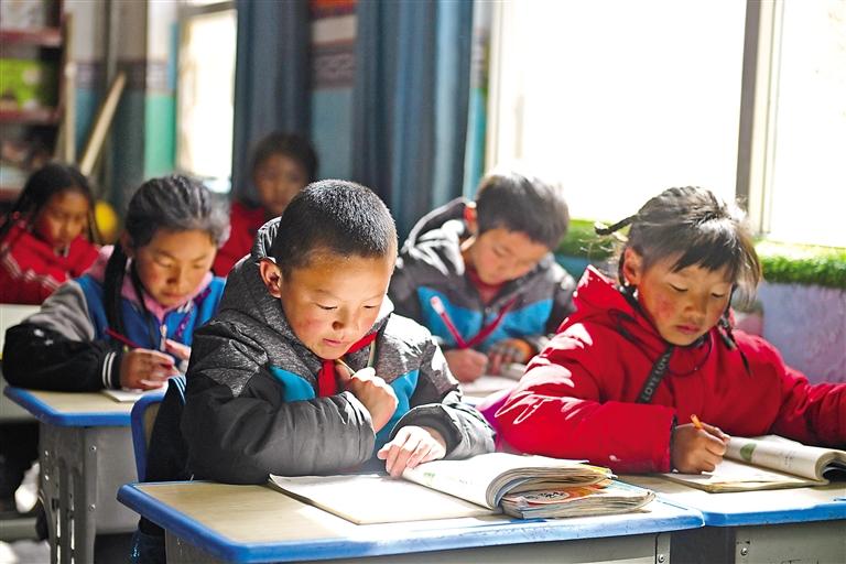 青海省玉樹藏族自治州曲麻萊縣巴干鄉(xiāng)寄宿制小學的學生在課堂上學習(4月22日攝)。新華社記者 張龍 攝