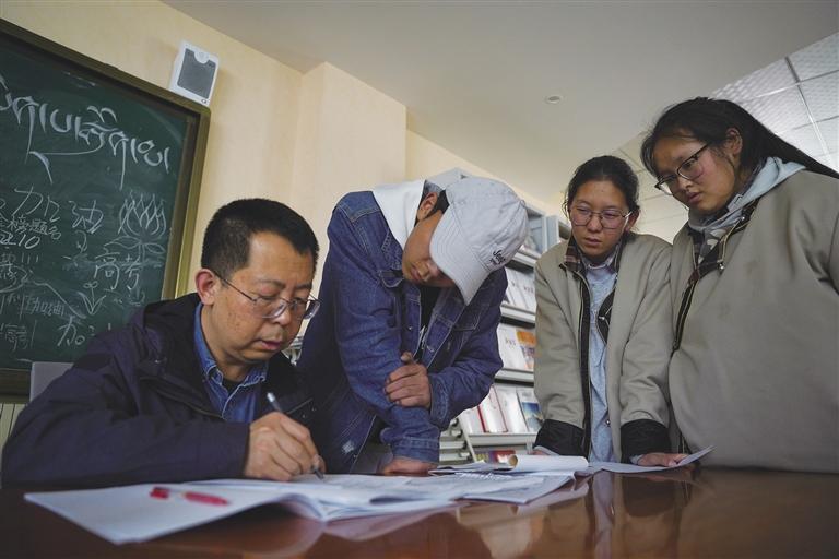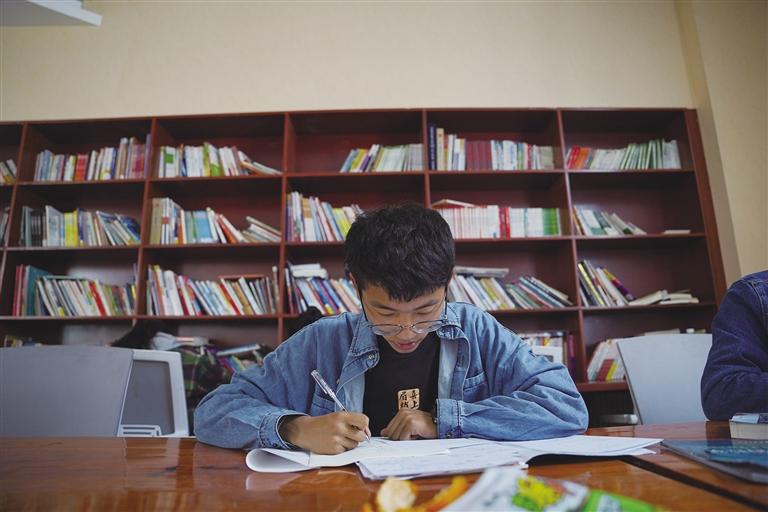 除了教室,閱覽室也是學(xué)習(xí)的好地方。在閱覽室,不少同學(xué)正奮筆疾書,只聽得見書頁翻動(dòng)和筆尖書寫的“沙沙”聲。陽光透過玻璃傾瀉在書桌上,暖暖地照在這些青春的面龐,把他們點(diǎn)綴成五月里最美的風(fēng)景。閱覽室的最里邊,一位老師正在認(rèn)真講解試卷上的難題,不一會(huì)兒同學(xué)們就露出了恍然大悟的表情?!拔液芟矚g來閱覽室學(xué)習(xí),這兒比教室更安靜些,可以讓我靜下心來做題?!睂W(xué)生扎西江村說。