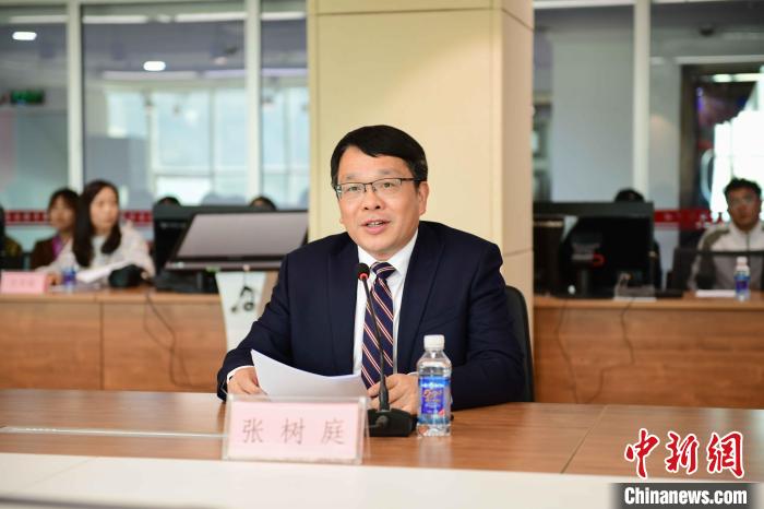 圖為西藏民族大學(xué)黨委常委、副校長(zhǎng),中國(guó)傳媒大學(xué)黨委常委、副校長(zhǎng)張樹(shù)庭在簽約儀式上講話。 貢嘎來(lái)松 攝