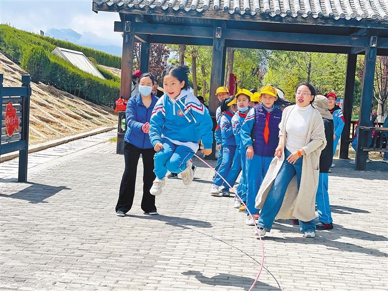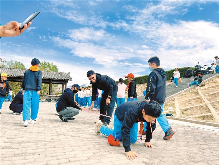 圖為拉薩市第一小學(xué)學(xué)生們?cè)诶蠋煹膸ьI(lǐng)下開展戶外活動(dòng)。