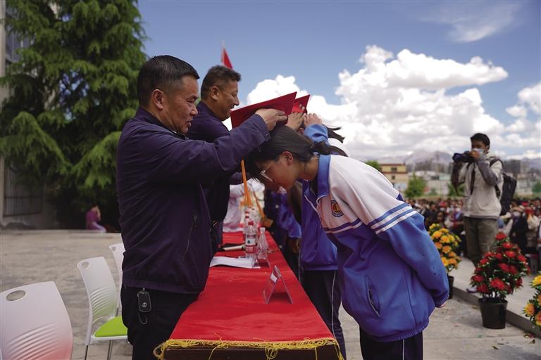 冠笄之禮,是中華民族重要的文化遺產(chǎn),更是長(zhǎng)大成人的象征?;顒?dòng)中,同學(xué)們戴上成人禮帽,以成人的姿態(tài)、豪邁的語(yǔ)調(diào)向著鮮艷的五星紅旗莊嚴(yán)宣誓,向祖國(guó)、向社會(huì)、向未來(lái)作出了莊重的承諾。拉薩市第四高級(jí)中學(xué)副校長(zhǎng)陸彭飛對(duì)這群充滿蓬勃朝氣和無(wú)限希望的學(xué)子們表達(dá)了衷心的祝愿,他希望同學(xué)們懷揣感恩之心,敢于拼搏、勇于超越,用奮斗給自己最美的青春交上一份滿意的答卷。