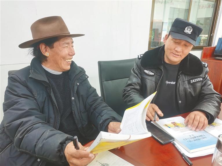 圖為聶孜村第一書記旦增(右)與村黨支部書記米瑪(左)正在用國家通用語言進(jìn)行情景模擬對話。記者 汪純 攝