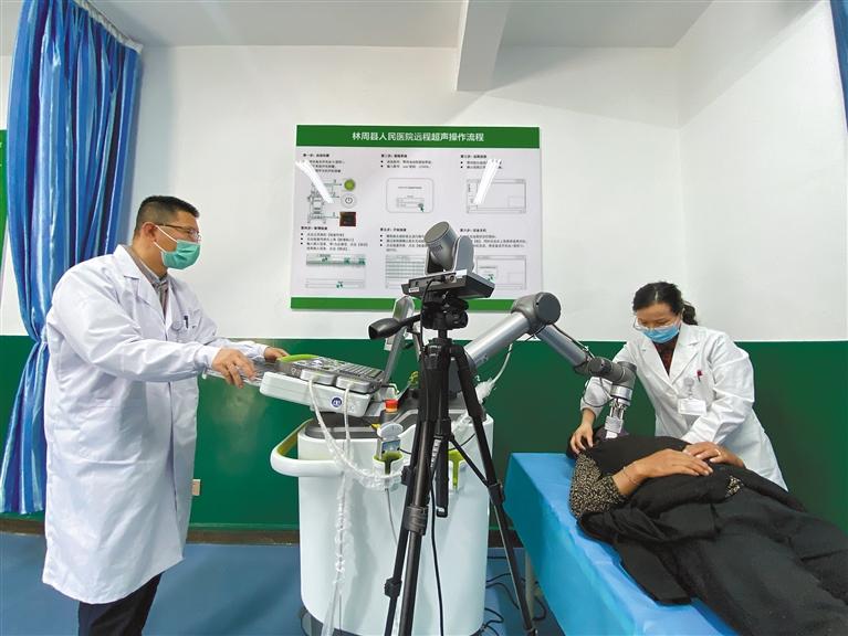 蘇州市援藏工作組引進第一臺5G遠程超聲機器人。圖為醫(yī)生使用遠程超聲機器人為患者檢查。