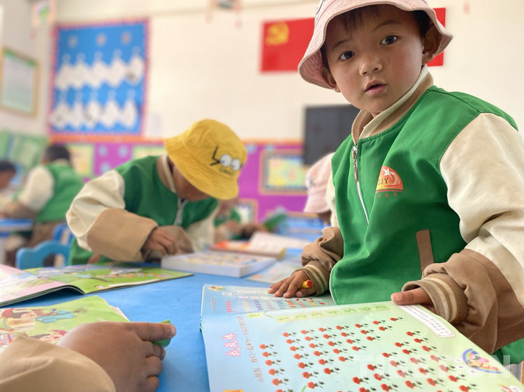 圖為西藏自治區(qū)日喀則市桑珠孜區(qū)江當(dāng)鄉(xiāng)雷貴村幼兒園孩子們翻閱書籍 攝影:王媛媛