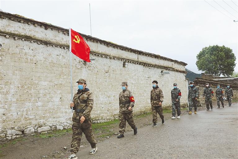 圖為扎雪村民兵隊伍在村莊內巡邏。通訊員 洛克 攝