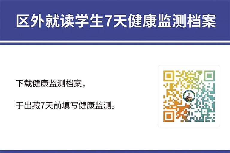 根據(jù)拉薩市委、市政府和自治區(qū)教育廳部署安排,為準(zhǔn)確掌握學(xué)生出藏行程規(guī)劃,為民航、鐵路等交通部門調(diào)配運(yùn)力提供參考依據(jù),拉薩市教育局需精準(zhǔn)掌握居住在拉薩市的區(qū)外就讀西藏籍大學(xué)生、區(qū)外非西藏班就讀西藏干部職工子女、區(qū)外就讀進(jìn)城務(wù)工人員子女、旅居區(qū)內(nèi)的區(qū)外學(xué)生出藏相關(guān)信息,請廣大家長、學(xué)生積極配合,掃描以下二維碼,填報出行信息;下載健康監(jiān)測檔案,于出藏7天前填寫健康監(jiān)測。